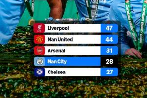 外媒列英格兰球队历史夺冠榜:曼城28冠超蓝军独占第4,距枪手3冠