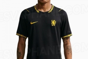 切尔西新赛季客场球衣谍照:简约黑色设计,衣领、袖口金色点缀