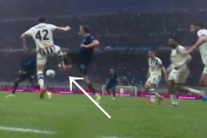 VAR裁判室: “让我看之前那个角度:这里他踢到了球,国米球员也碰到了。动作很轻。让我看动态回放:他的腿是弯曲的……检查完毕,动作很轻,虽然有接触但非常轻微。触碰极小,并不是踢了一脚。”